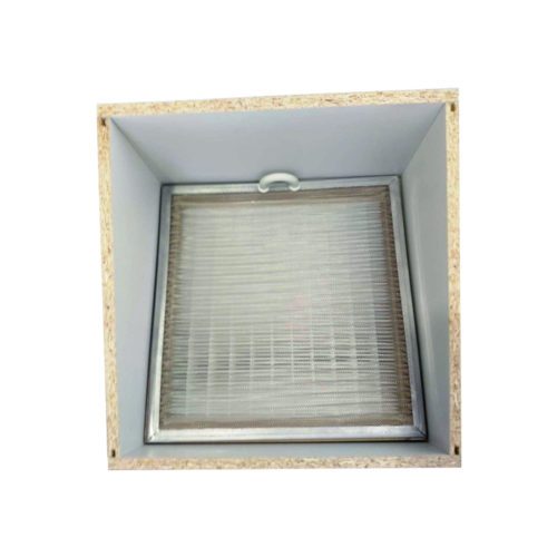 Luftreiniger mit HEPA H14-Filter (Glasfaser, zertifiziert nach EU-Norm EN 1822-1) und Edelstahl-Vorfilter.